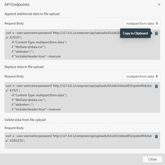 There are two operations that can be performed using the Upload API: appending additional data and clearing previously uploaded data. The source creation page offers convenient example cURL requests but the APIs can be leveraged from your preferred development platform. Select API Endpoints on the source creation tab to edit your data.