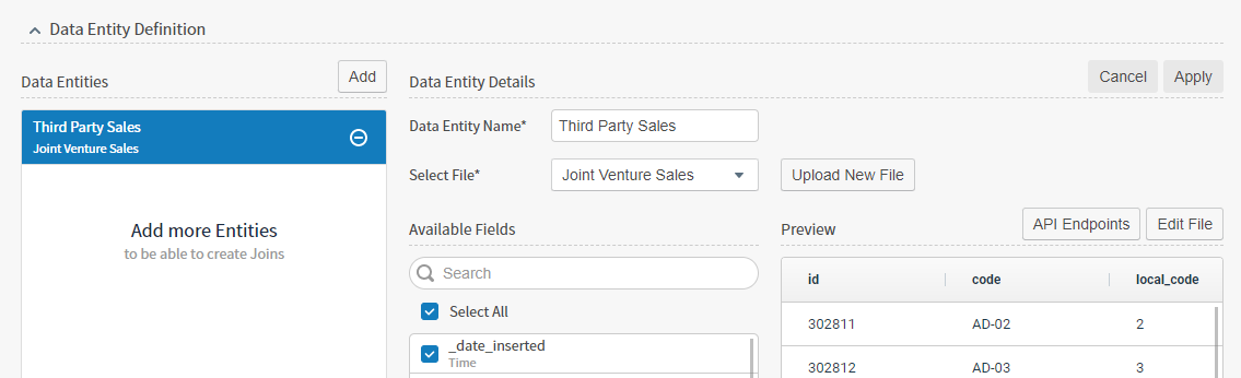 Select the data entity with the file you want to edit, then select API Endpoints. The API Endpoints dialog box opens.