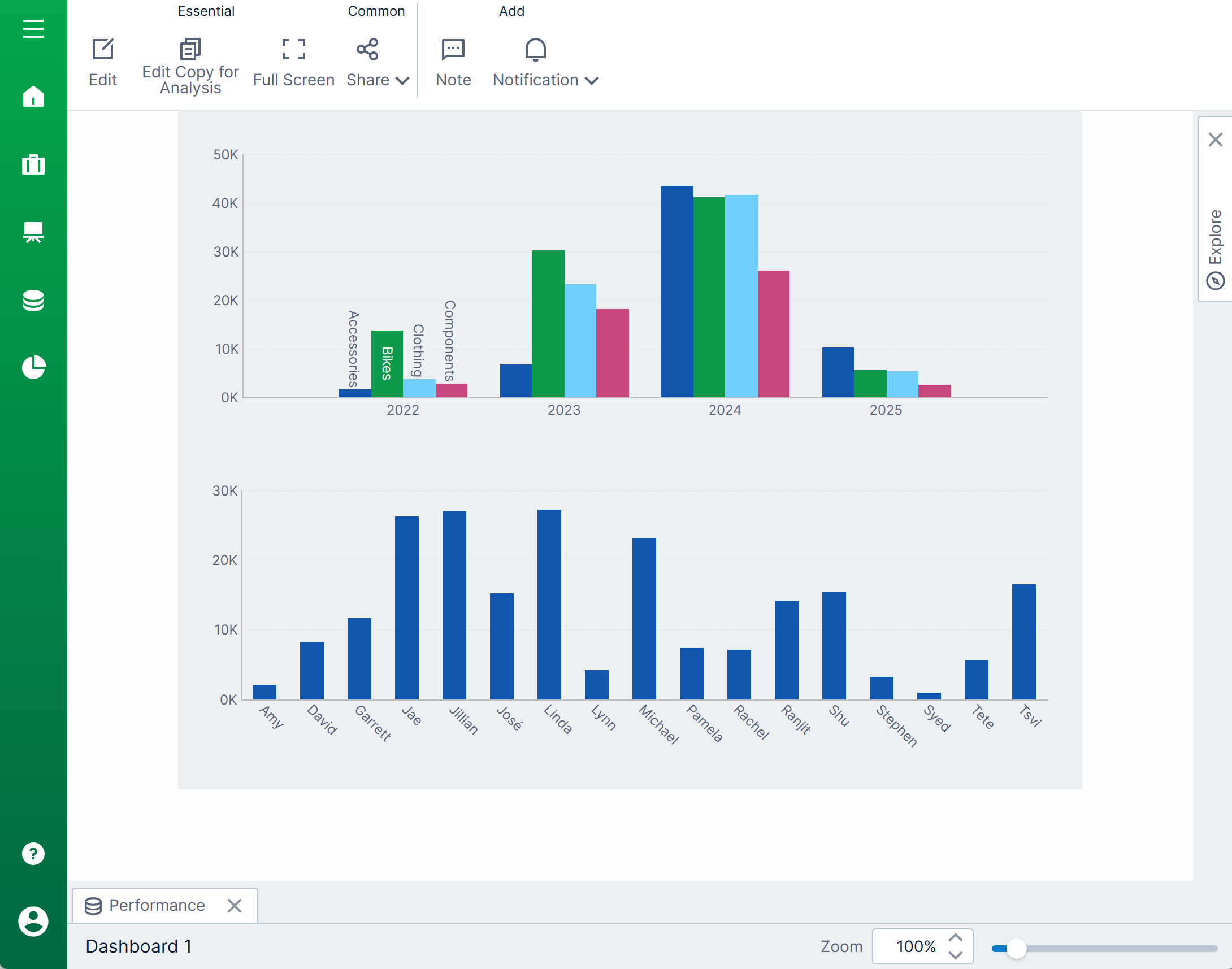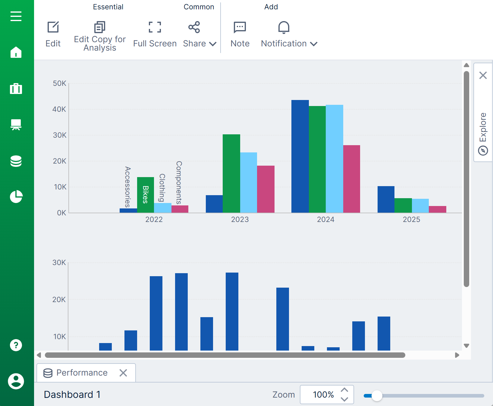 With the dashboard set to Resize in this example, observe that the dashboard can be manipulated into different aspect ratios, or made smaller, but visualizations such as charts are able to adjust their layouts intelligently to match.
