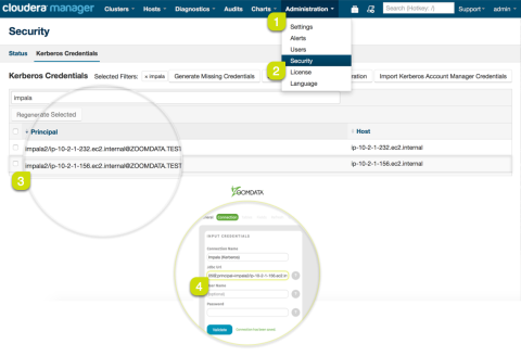 For <impala_principal@KERBEROS.REALM>, enter the principal of the node you are connecting to. To get the list of all Impala principals, navigate to Cloudera Manager > Administration > Security > Kerberos Credentials.
