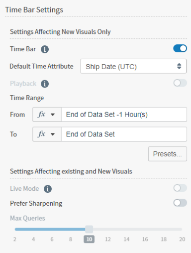 If you enable live mode for a data source (Enable Live Mode checkbox), you can set the refresh rate and delay time. The time bar defaults expand to show these settings.