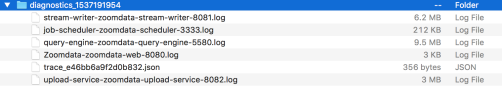 The diagnostics bundle is primarily useful as an easy way to send Symphony the information needed to help you debug a problem. The bundle is a zip file containing all the current log files from all Symphony's microservices. If distributed tracing is enabled and properly configured, the diagnostics bundle may also contain a JSON trace file with the trace ID you specify.
