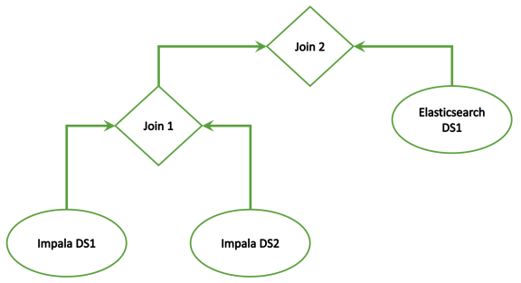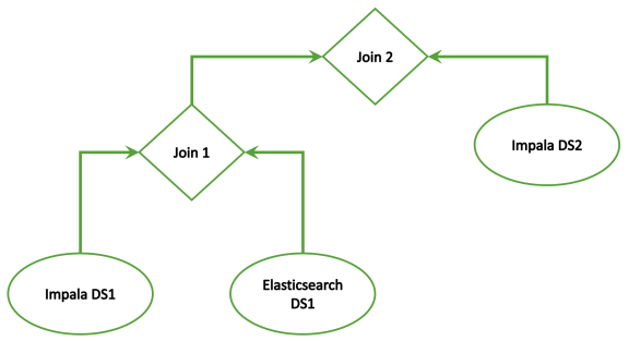 In the following two fusion data sources, Fusion Data Source 1 will be pushed to the Impala connector to perform, whereas Fusion Data Source 2 will be performed in-memory because the two data sources use different Impala connections.
