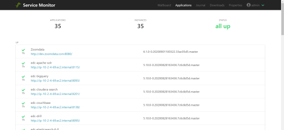The Applications view shows all the Symphony microservice types used in your installation. It also identifies the instance URLs, and indicates how many instances there are of each and how long they have been running. If more than one instance of a microservice is running, you can expand the microservice type to see the specific instance URLs.