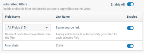 Select a visual in the Visuals list on the left of the tab. The right side of the tab show the link filters to which the visual can subscribe in the Subscribed filters table.