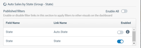 Select a visual in the Visuals list on the left of the tab. The right side of the tab show the link filters available to be published in the Published filters table.