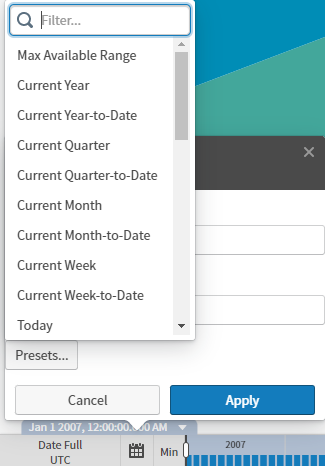 Use the filter box at the top of the presets list to locate the preset setting you want. Descriptions of each of the preset options are provided in Preset Time Ranges.