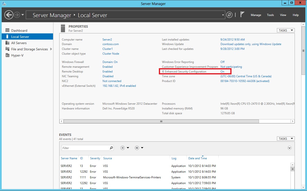 The issue is that the IE Enhanced Security is enabled in Internet Explorer. To disable it, open Server Manager, and go to Local Server. Go Properties, and look for IE Enhanced Security Configuration.