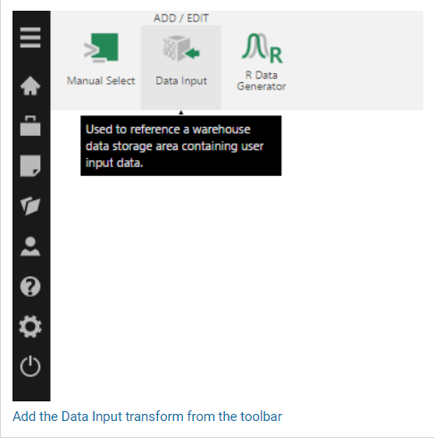 When creating a new data cube, you can add the Data Input transform to an empty canvas from the toolbar.