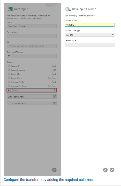 In the configuration dialog for the transform, the key task is to add new columns that will contain the input data. Click Add Column and complete the Data Input Column dialog.