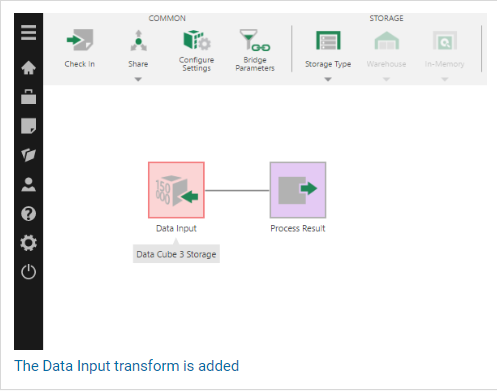 The Data Input transform is added to the data cube and connected to a Process Result transform automatically.