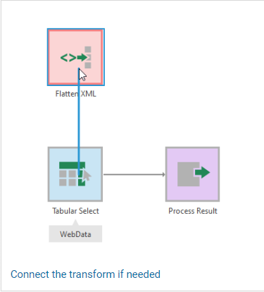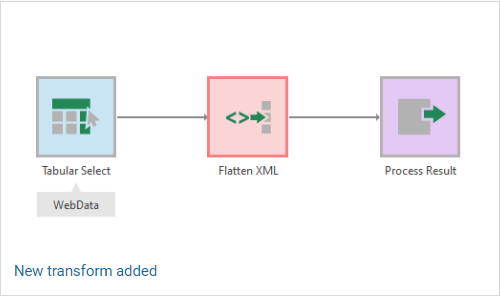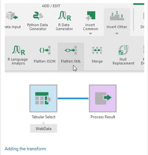 Optionally, click to select an existing connection between two of your transforms where you want to insert one. In the toolbar, choose Insert Other,then Flatten XML.
