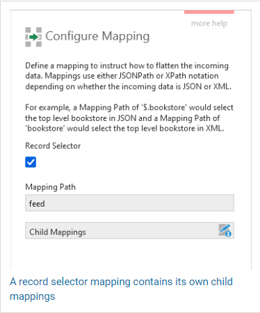 A mapping with [Record Selector] as its column name indicates there can be multiple child elements of that type within each of the current parent element type, so the child elements will be turned into multiple records (rows of data) and then combined/joined with the parent record. Only one of these can be enabled at each level of mappings at a time to prevent excessive duplication of the parent record's values.