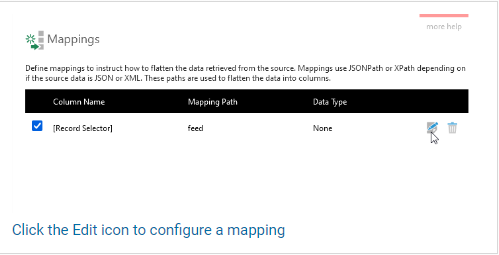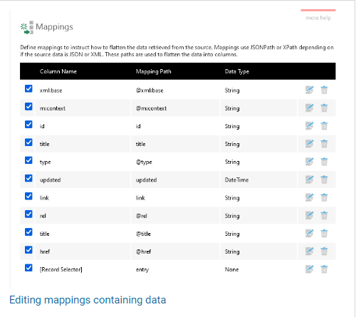 Mappings representing data that will be turned into columns will have a type listed in the Data Type column. You can edit these mappings if you want to change the data type to something else that will be compatible with that property's values.