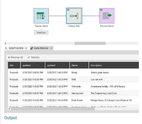 After submitting the configuration dialogs, you can preview the output by opening the Data Preview window with the transform selected.