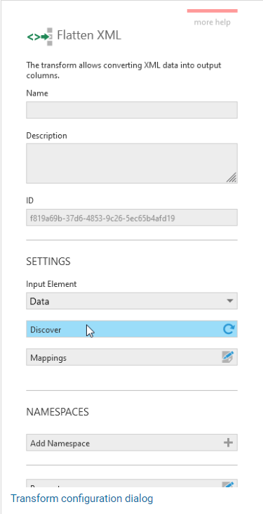 Next, click Discover to automatically populate mappings and other details defining the structure and data types of your columns based on the current input XML. A notification will appear in the lower right corner of the screen when complete, often right away.