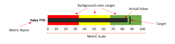 Bullet gauges are based on a single metric. The metric is mapped against a background bar that shows value ranges using color. A metric scale is also shown. Finally, a small vertical bar represents a marker for the target value of the metric. Bullet gauges are supported by all Symphony data connectors.