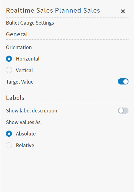 Select how the target value for the bullet gauge metric is set. Select Value if a raw data value should be used. Select Percent of Maximum if a percentage of the maximum value should be used.